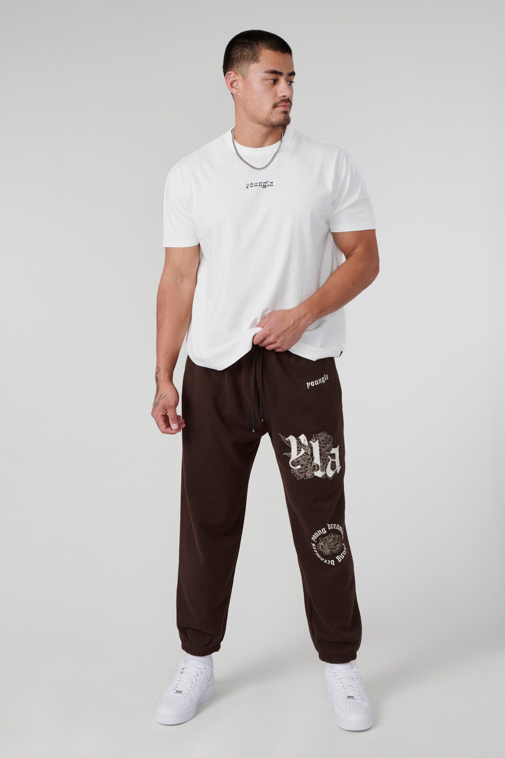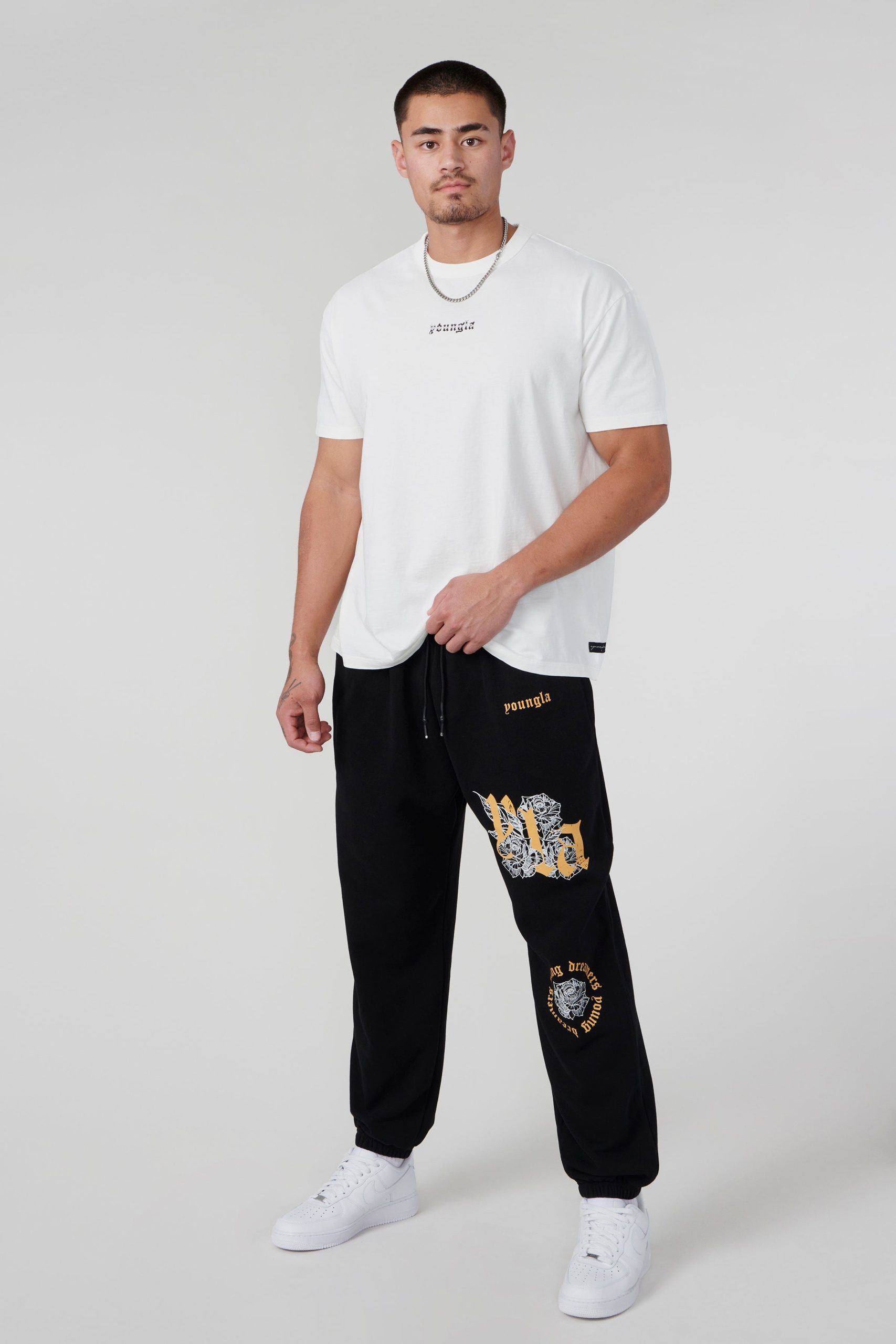 DESIGN: Introducing our Rose Joggers: Add a floral touch to your style. These joggers feature a delicate rose design along with an old english YLA logo on the left leg, offering a unique look. With the same great fit as our Dreamer Joggers, enjoy both comfort and style.