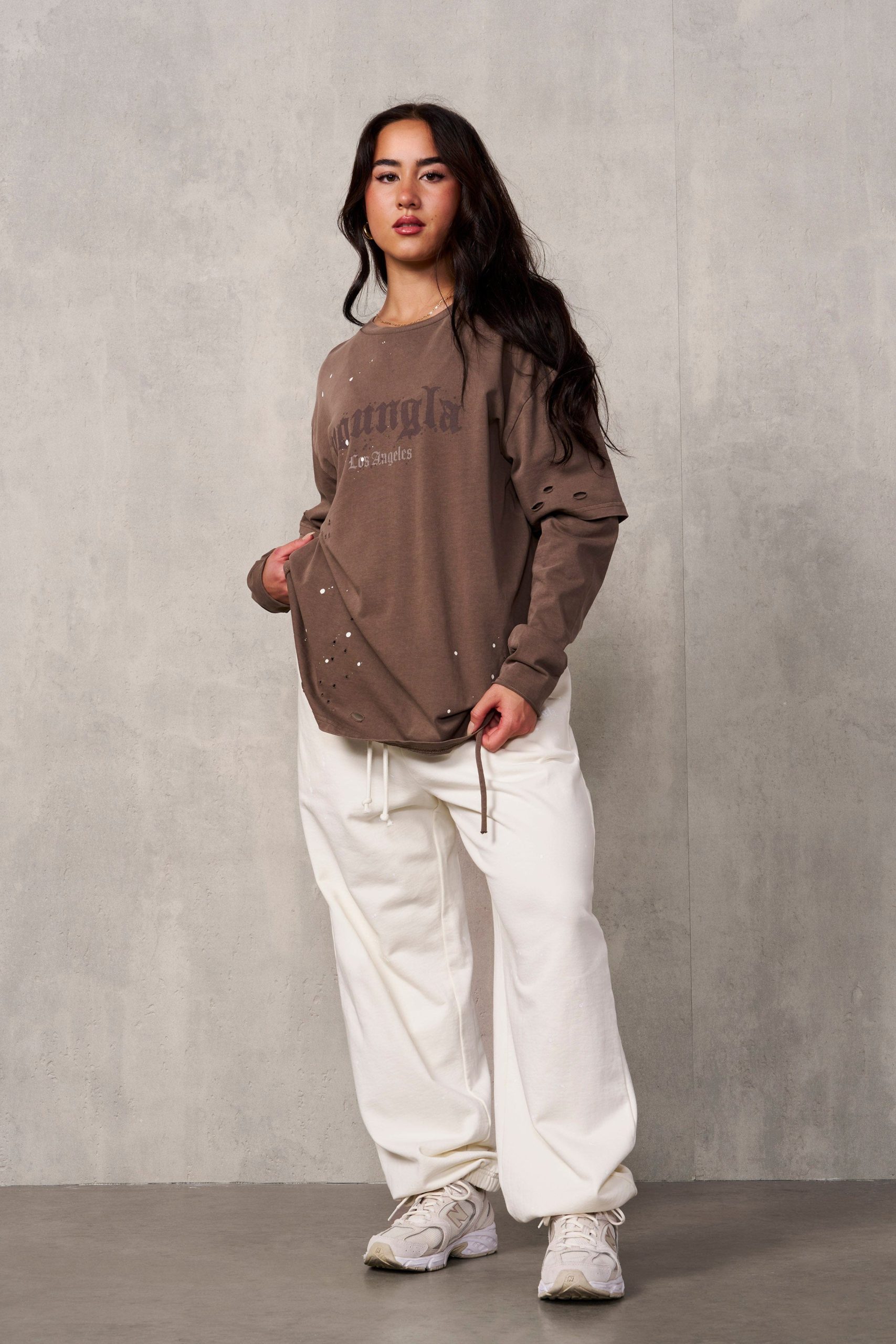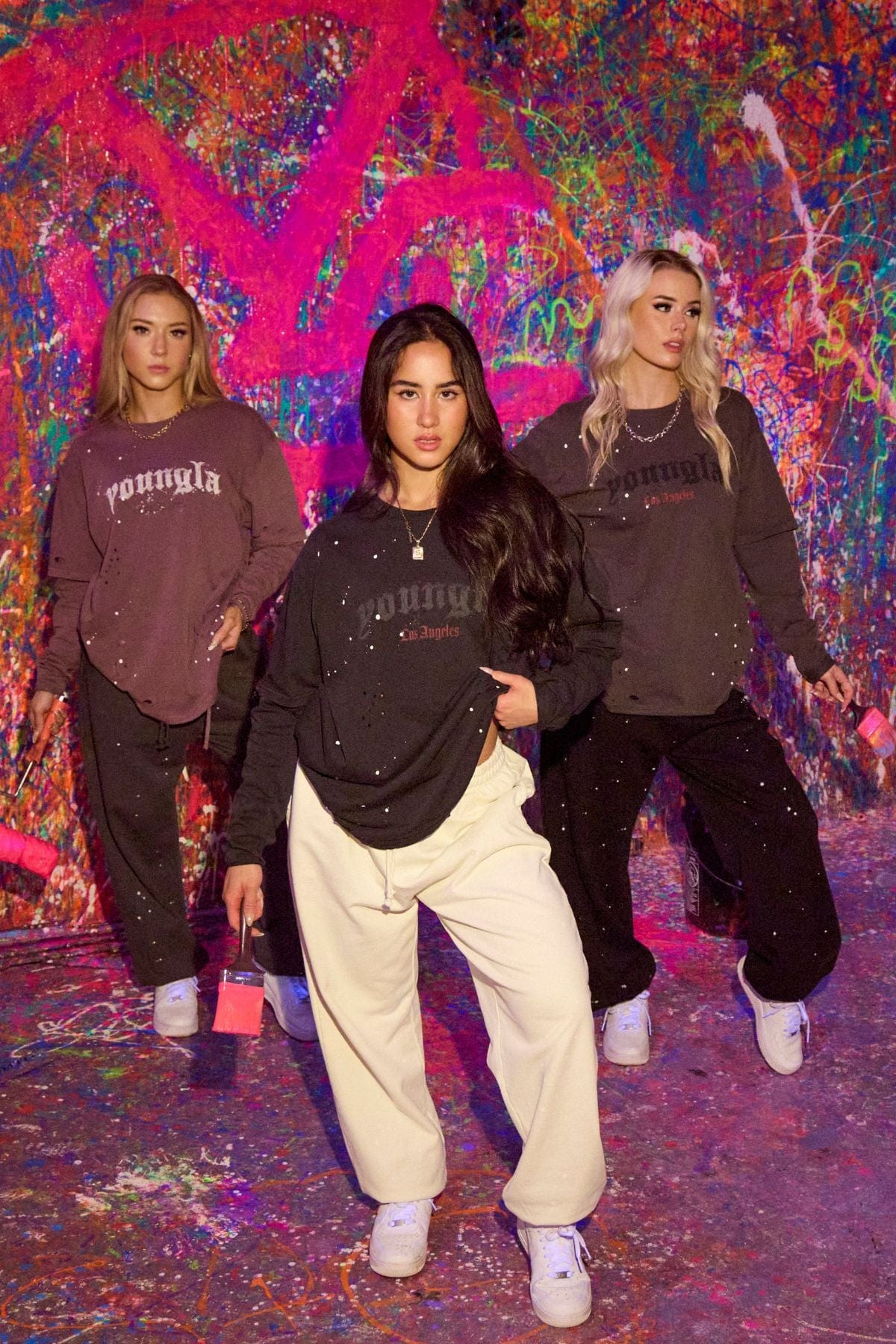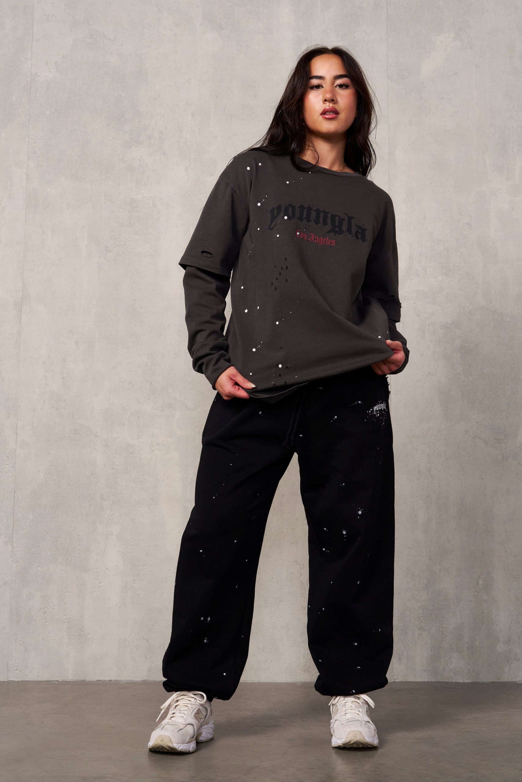 DESIGN: The “Ravage Joggers” are oversized pants featuring distress around the pockets, and paint splatter for a bold, distressed look. With a relaxed fit and edgy design, they’re perfect for a rebellious, street-style statement.