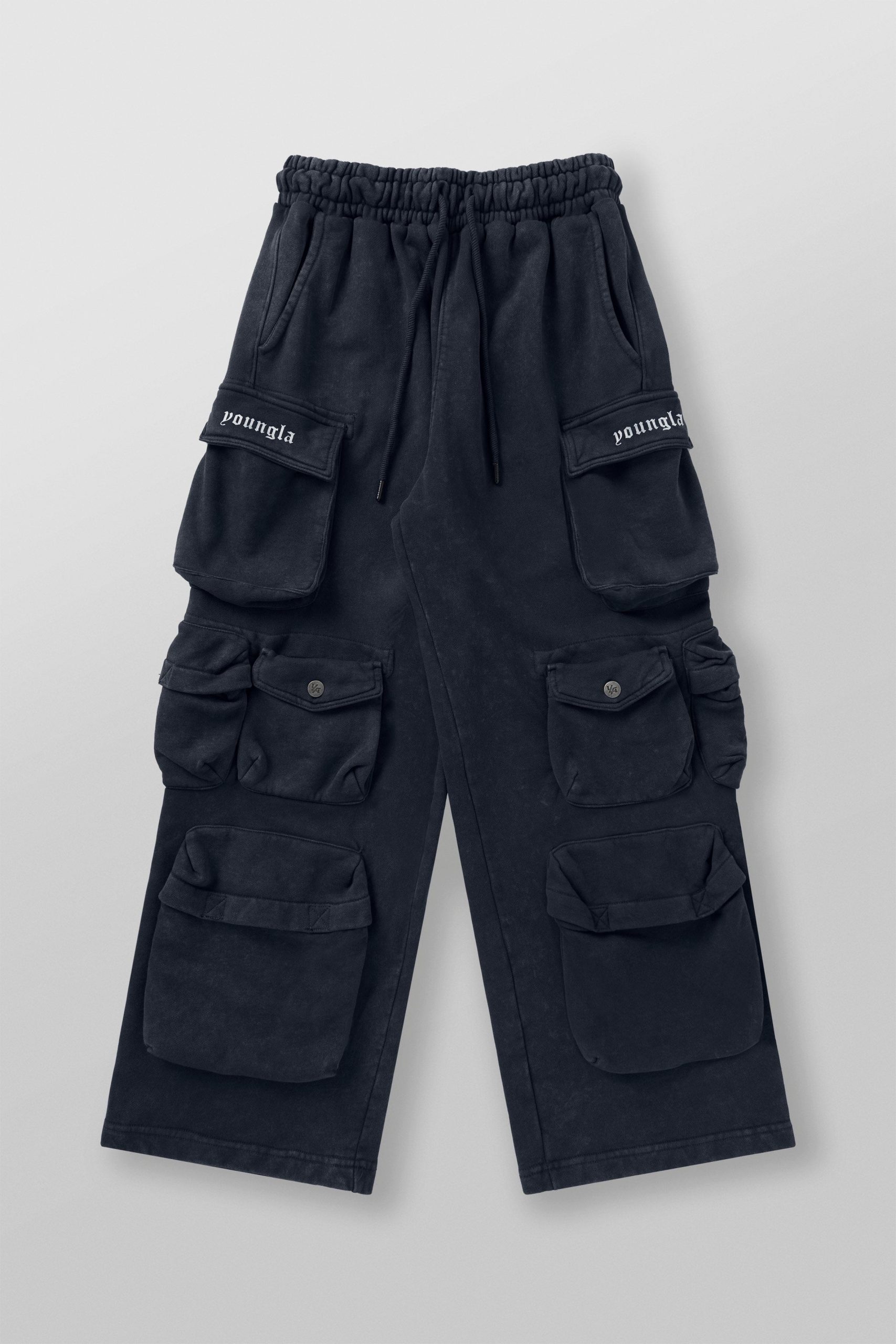 DESIGN: Make a bold statement with the Hella Pocket Joggers by YoungLA. Crafted from heavy-duty 475 GSM cotton and acid-washed for a vintage look, these baggy, no-cuff joggers feature multiple cargo pockets for both style and functionality. The YoungLA logo is embroidered on the pocket flap, and each button is embossed with the YLA branding for added detail. Perfect for a relaxed, edgy style that combines comfort with a distinctive look.
