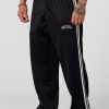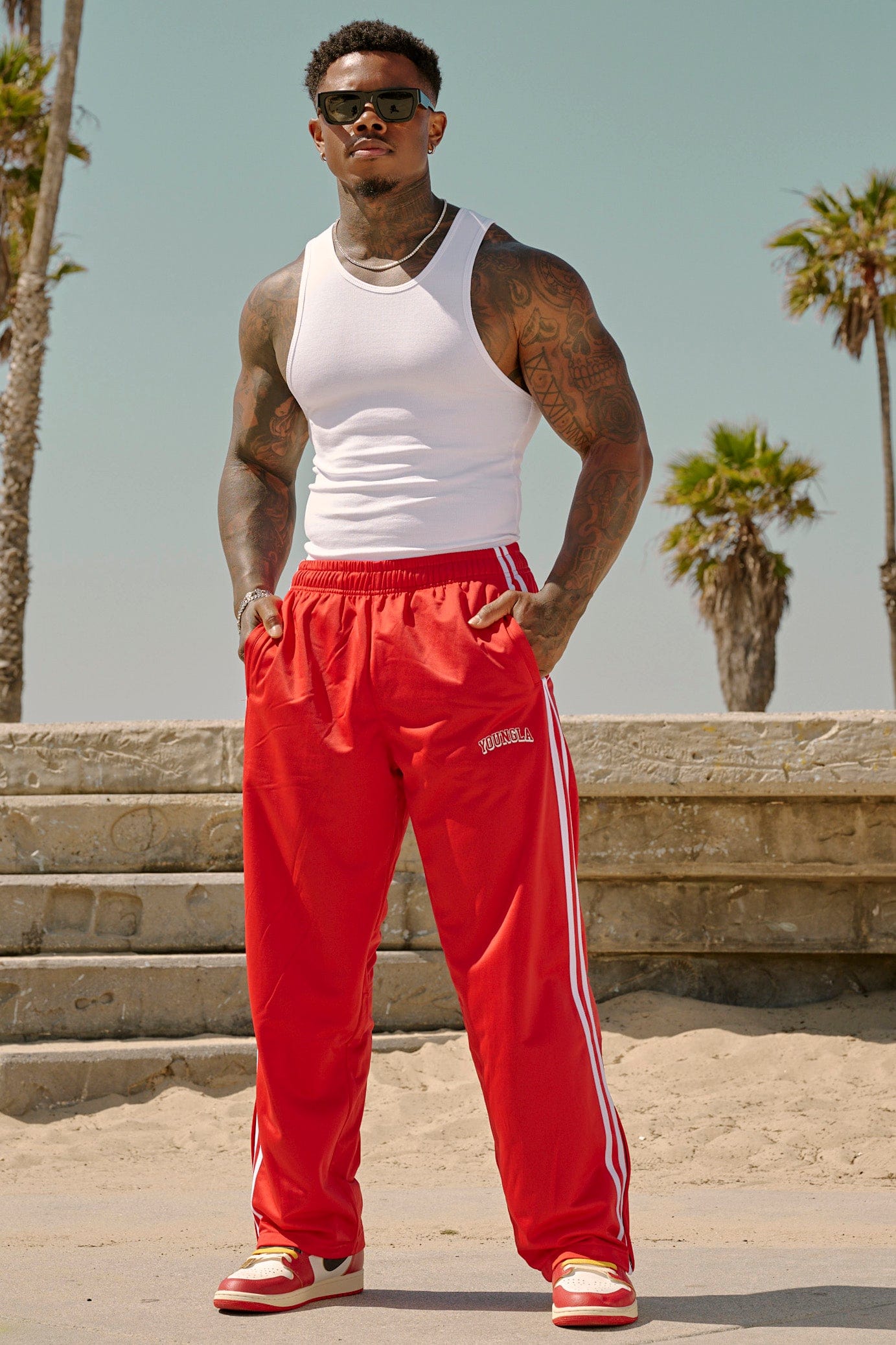 DESIGN: The Retro Warm-Up Track Pants bring back classic athletic style with a modern twist. Made from lightweight polyester, these loose-fitting pants feature dual side stripes and zippered cuff openings for easy on-and-off over sneakers.