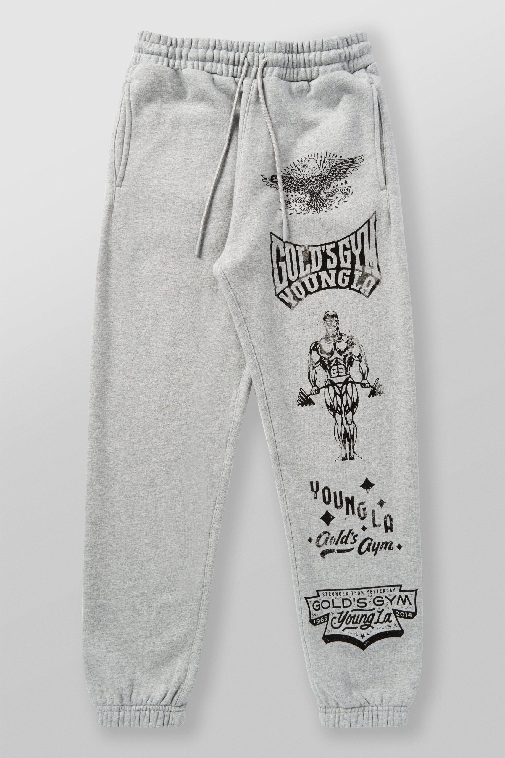 DESIGN: Introducing the Gold’s Gym x YoungLA cuffed joggers – inspired by YoungLA’s best-selling Immortal Joggers. These joggers feature bold printed logos along one leg, blending classic gym heritage with modern streetwear style. Perfect for comfort and style, they bring the iconic look of Gold’s Gym to a versatile everyday piece.