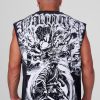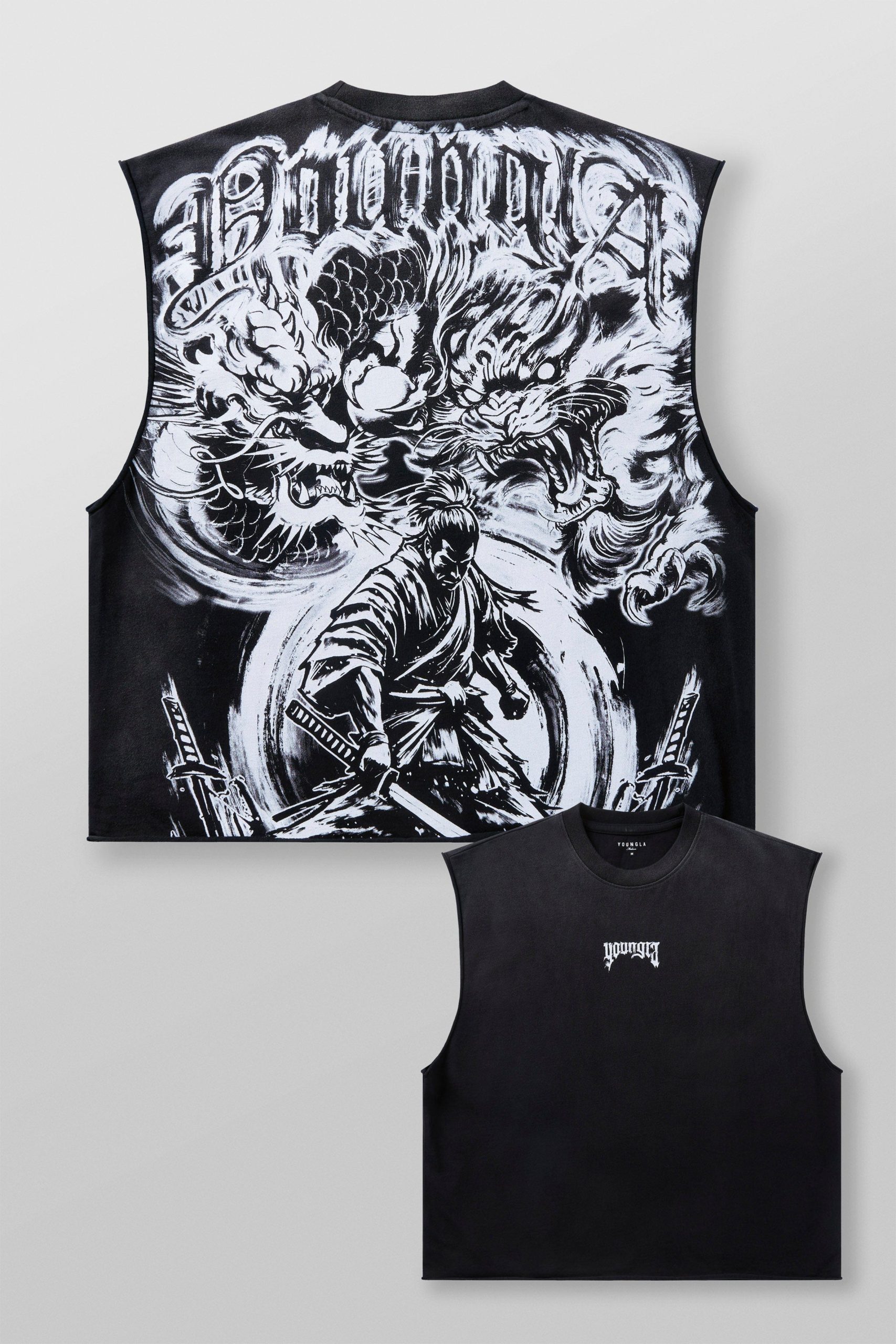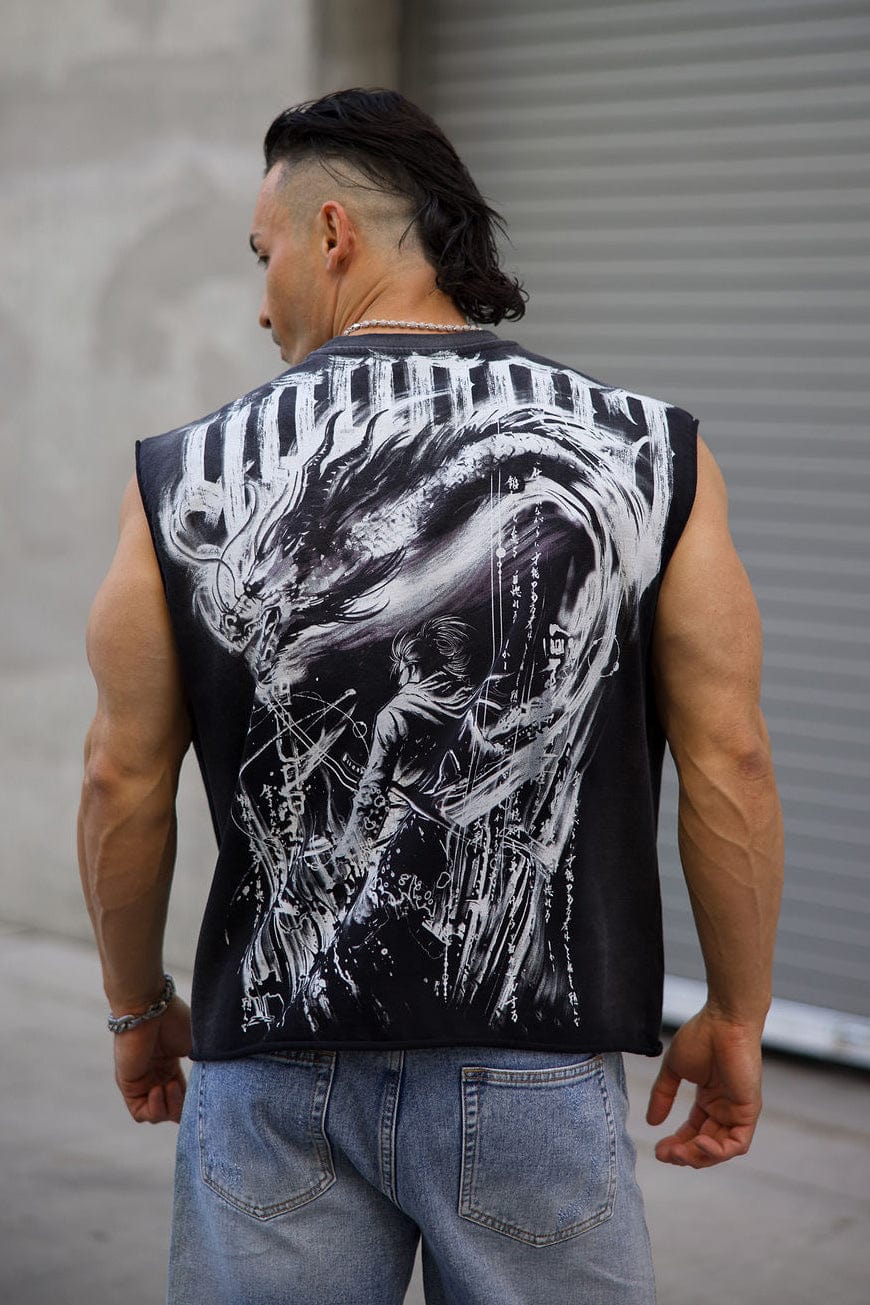 DESIGN: Inspired by warrior spirit, the Samurai Cutoffs feature a bold oversized graphic on the back showcasing a samurai surrounded by mythical beasts. Made from 100% cotton with a 290 GSM weight, it offers a structured feel with a true-to-size fit. Clean on the front with subtle branding.