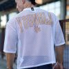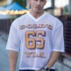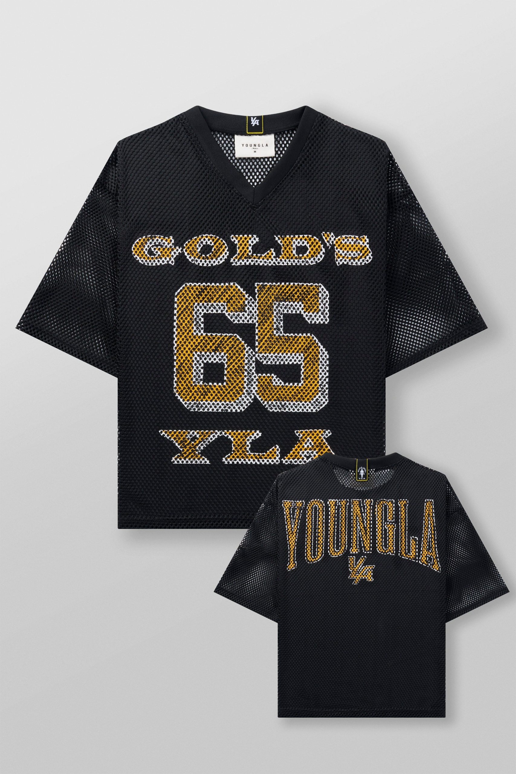DESIGN: Introducing the Gold’s Gym x YoungLA Mesh Jersey, a perfect blend of retro vibes and modern style. This versatile V-neck jersey is crafted from breathable mesh, making it ideal to wear on its own or layered with an undershirt for added flair. A timeless throwback with contemporary updates, this classic piece combines the legacy of Gold’s Gym with YoungLA’s street-inspired design, delivering a bold and iconic look.