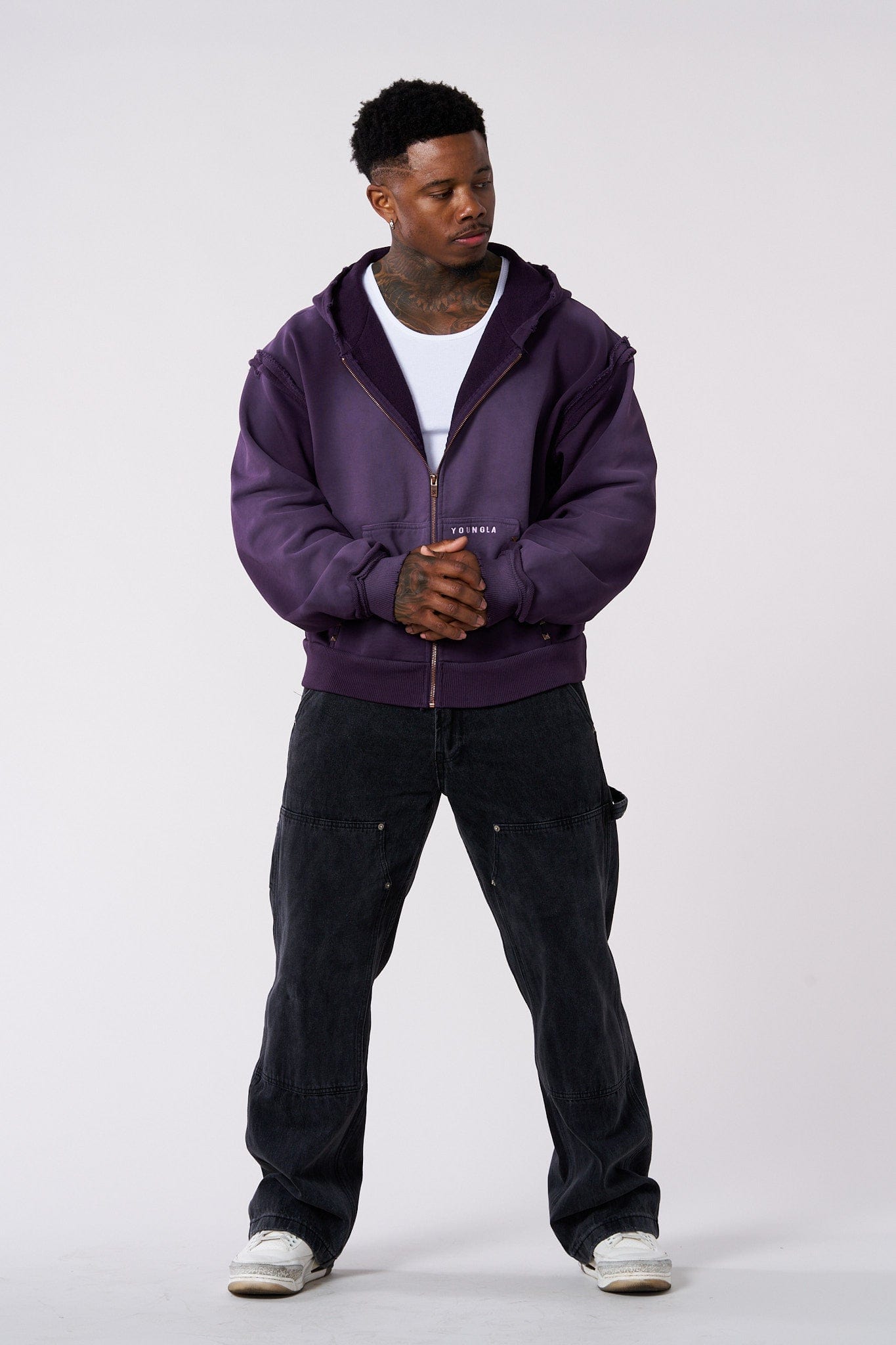DESIGN: The Deconstructed Terry Hoodie is a bold blend of raw aesthetics and premium craftsmanship. Made from 620 GSM heavy French Terry, its 100% cotton build offers structure and comfort. Raw seams and studs on the pocket add an edgy, unfinished look, while the washed effect enhances its vintage appeal.