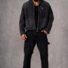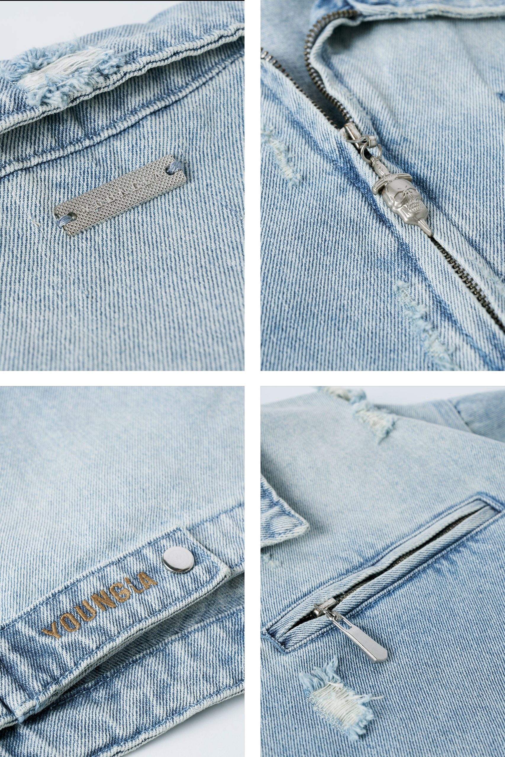 DESIGN: Introducing the Swaggy Jean Jacket – where classic denim meets edgy style. Crafted from 100% cotton and available in two vintage-inspired washes, black and blue, this jacket is your go-to for a dose of instant swag. It features distressed cuts throughout for a worn-in, retro vibe, while a textured metal tag on the back and a custom skull-and-dagger zipper pull add unique branding details.