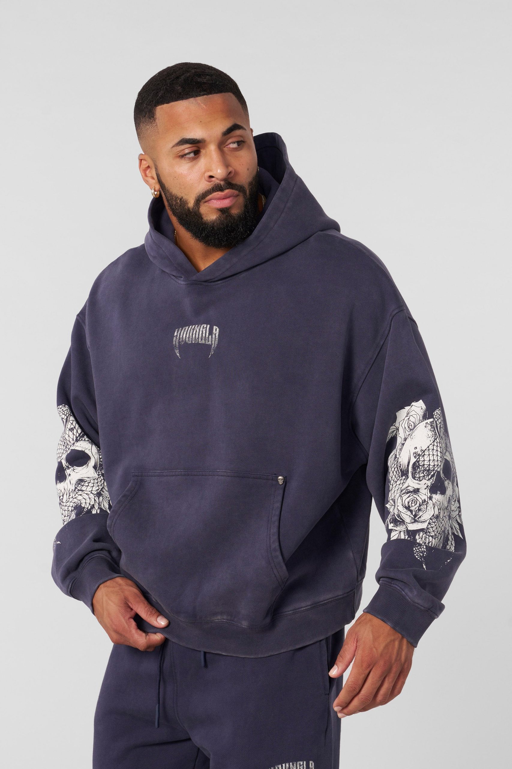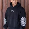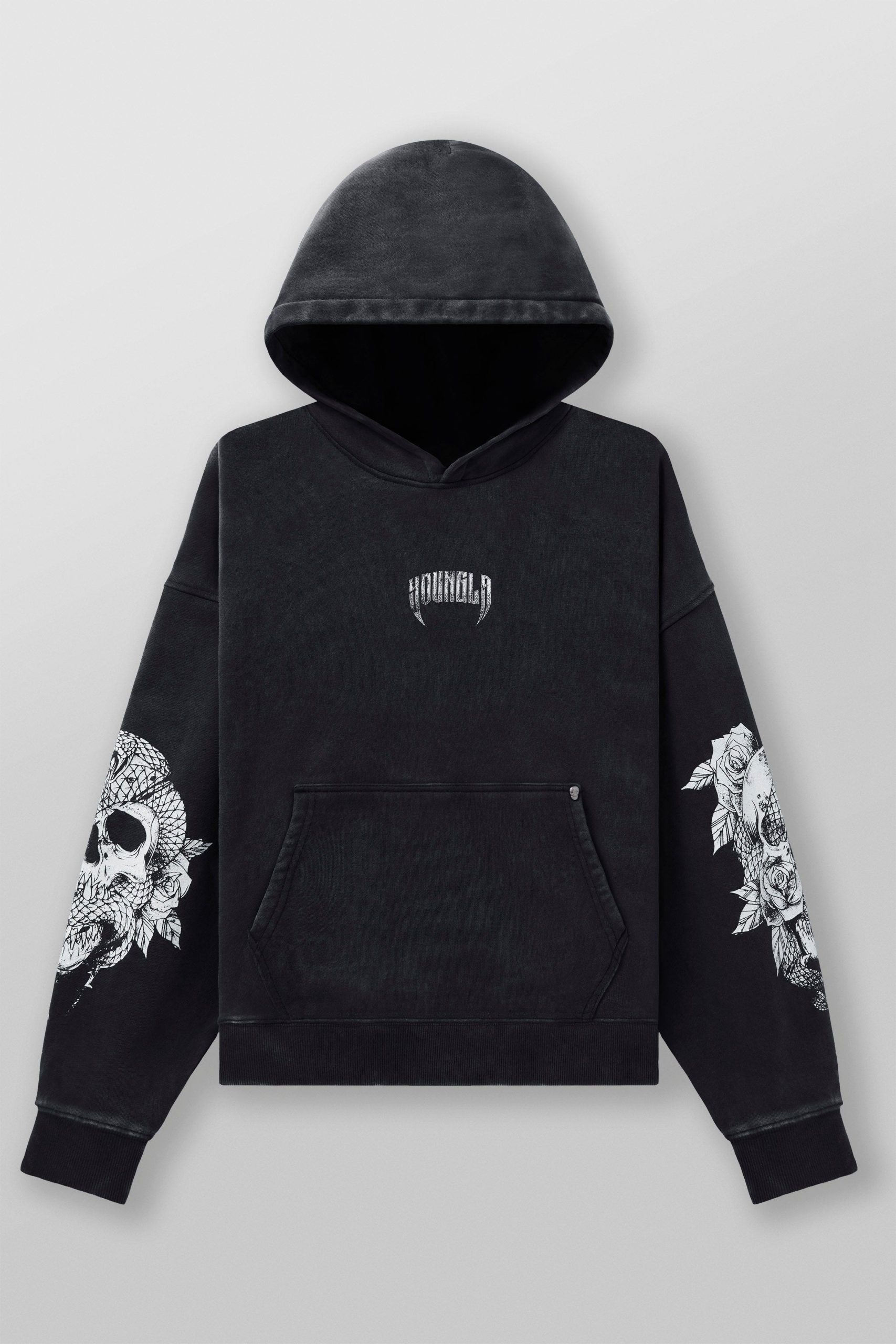 DESIGN: This loose-fit pullover hoodie combines comfort and bold design with intricate skull prints on each sleeve. Made for a relaxed fit, it features a spacious front pocket and a subtle logo on the chest, making it a perfect choice for staying cozy while keeping your streetwear style on point.