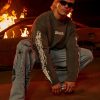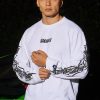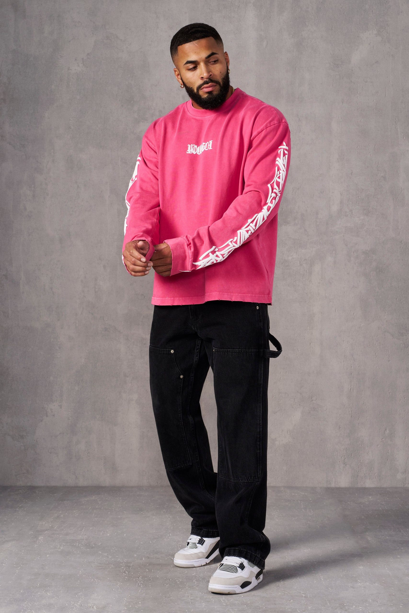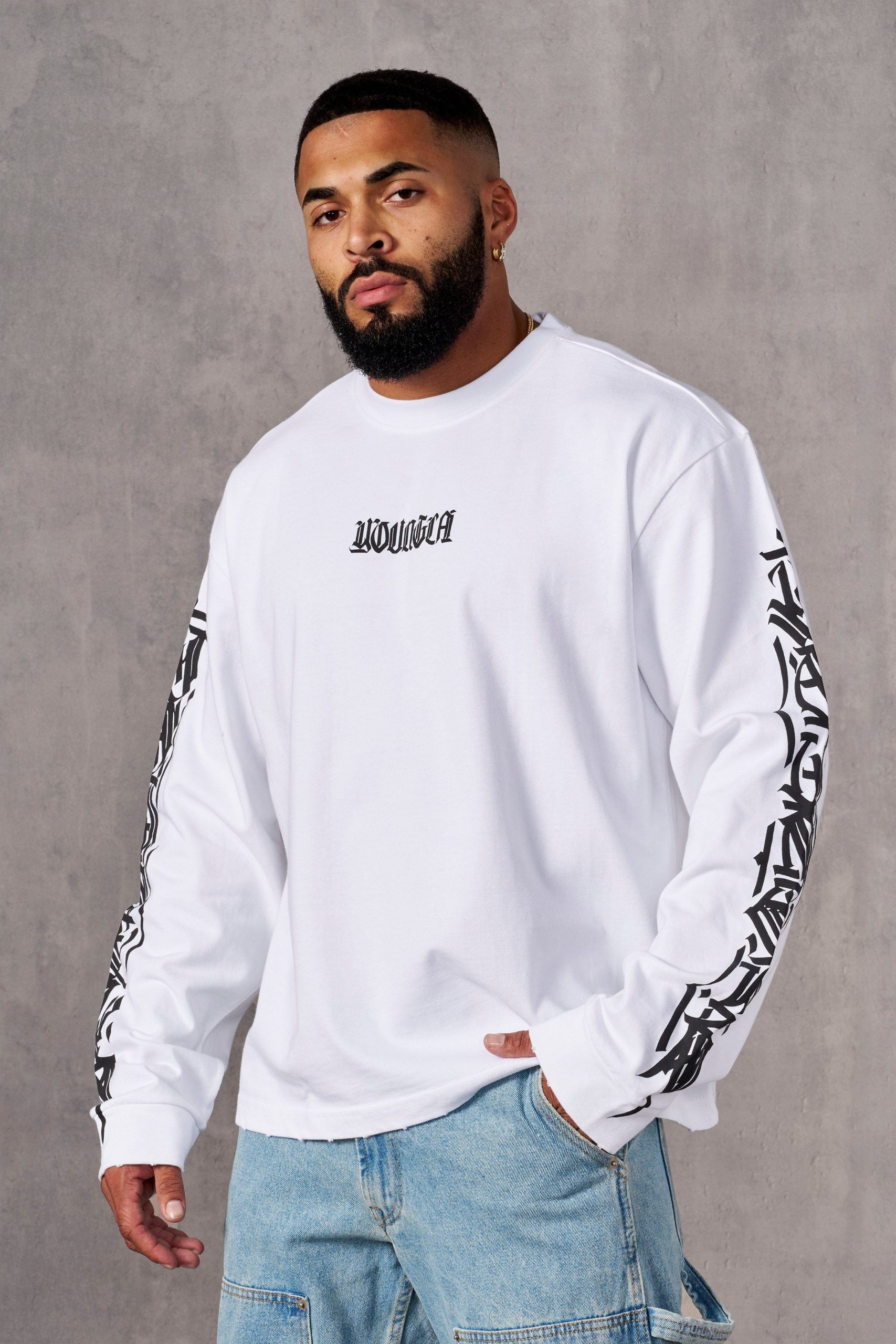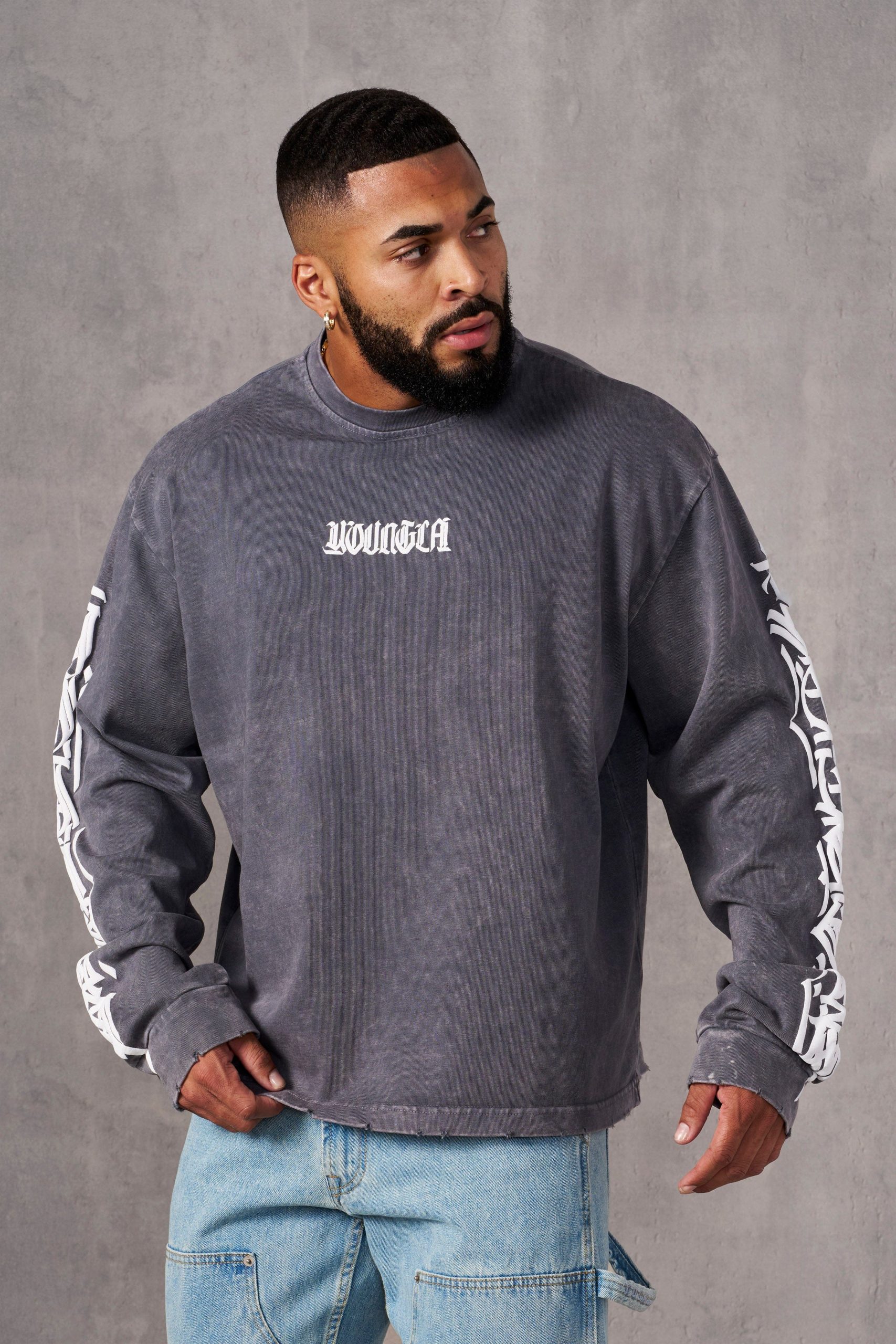 DESIGN: Elevate your style with these long sleeve tees, featuring distressed details on the cuffs and hem for an effortlessly rugged vibe. The acid wash treatment gives it a vintage edge, while the bold puff-printed calligraphy runs down each sleeve for an eye-catching finish.